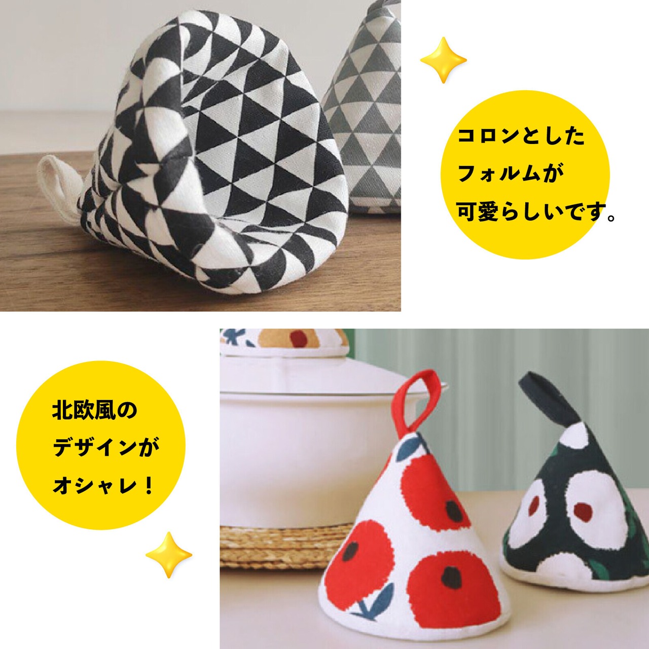 北欧風の柄と三角形のころんとした形がキッチンを華やかにしてくれます♡